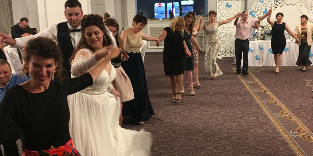 La soirée s’ouvre par le fameux slow des mariés sur un nuage de vapeur. S’enchaîne le premier set et tout le monde se tient main dans la main pour la hora. Les musiciens se déplacent au milieu des cercles et les invités donnent des billets à la chanteuse ou au saxophoniste. Tu peux voir un extrait ici. Ça dure bien 4 heures avec des pauses. Vers minuit, les entrées sont servies, puis rebelote pour la hora “haïde, haïde, haïdeeee”, avec entre tout ça des shots de palincă! Les musiciens sont excellents et les chanteurs assurent le show! “De la viața nu-ai nimic, daca nu-ti petreci un pic” chante Razvan, qui veut dire “tu n’auras rien dans la vie si tu ne t’amuses pas un peu”. Les chansons mettent à l’honneur les mariés, la famille, et l’alcool “vreau să beău” (je veux boire). Je regrette de ne pas comprendre les paroles, mais Marius note quelques phrases à la volée pour plus tard. Pendant ce temps, je me prête au jeu de la danse et de la répétition des mêmes pas. Quelques moments joyeux, notamment quand je me retrouve entre la mariée et un des danseurs les plus vivaces à suivre le tempo qui s’accélère à chaque tour. Mais au bout de 4 heures, il faut bien me l’avouer: la hora m’ennuie… Les rythmes effrénés du sax me donnent plutôt envie de danser plus librement avec ma jupe, de tourner, d’être moi même. Marius me fait les gros yeux quand il sent que je vais partir en free style et me dit que ce n’est pas le délire ni l’endroit et que ça pourrait être mal interprété…