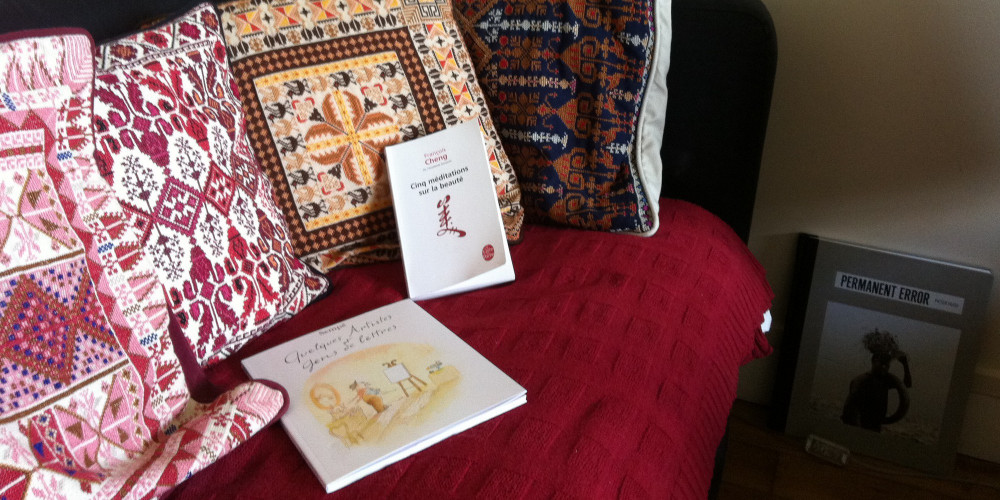 Du coup, depuis mon canapé, j’aperçois tout en bas d’une grosse pile de bouquins deux petits livres qu’on m’a offerts : Cinq méditations sur la beauté de François Cheng (112 pages très aérées) et Quelques artistes et gens de lettres de Sempé. Exactement ce qu’il me faut.