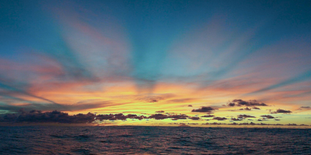 Les coucher de soleil sont nos spectacles préférés. Comme au cinéma, nous nous installons sur le pont et attendons le début de la représentation, de véritables incendies rouge, orange, jaune, traversant des nuages bleu gris, puis le rose qui explose, du vert parfois, ajoutant encore de l’espace à l’immensité sans terre, sans autre point de repère que l’horizon.
