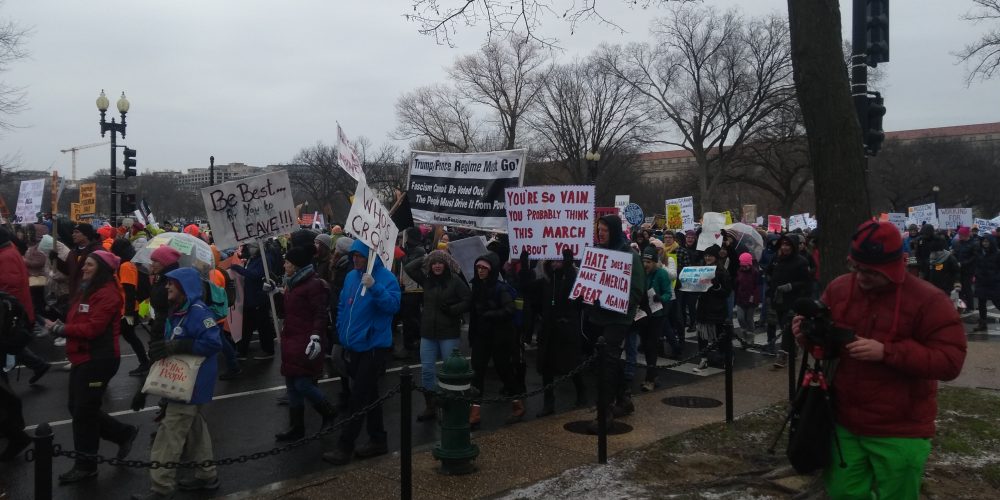 Beaucoup d’autres panneaux fleurissaient dans cette manifestation, porteurs de messages vraiment locaux comme « Trump dégage », « voter Warren », une des deux femmes candidates à l’investiture des démocrates, ou de revendications féministes plus universelles. J’ai vite repéré les activistes des plannings familiaux et ceux du droit à l’avortement et nous ai manœuvrés jusqu’à eux. D’une part, ces deux sujets font partie de mes combats, d’autre part, mon statut de migrante semi-légale ne m’autorise pas à critiquer publiquement le gouvernement en place.