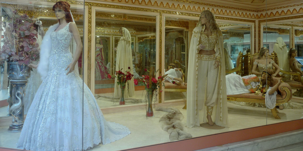 L’une des spécialités de notre quartier deTunis est la robe de mariée ou de mariage : on dénombre une trentaine de boutiques sur 4 à 5 rues adjacentes, avec aux devantures des mannequins anorexiques revêtues de robes froufroutantes, moulantes, chatoyantes…