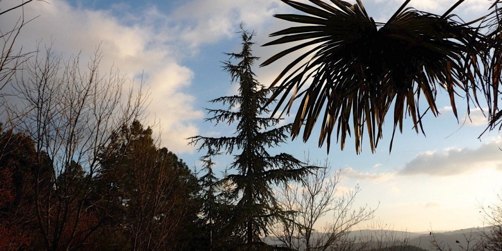 Télescopage horticole : un palmier s’encadre dans notre fenêtre ardéchoise. Ce n’est pas si insolite, la soixantaine de variétés de palmiers en comprend certaines résistantes au froid, mais vu le caractère bien local du gîte où nous sommes, avec ses reproductions de cartes postales anciennes, sa toile cirée alternant gerbe de fleurs et de blés, je m’interroge sur les motivations du propriétaire à planter cette espèce pas vraiment endémique.