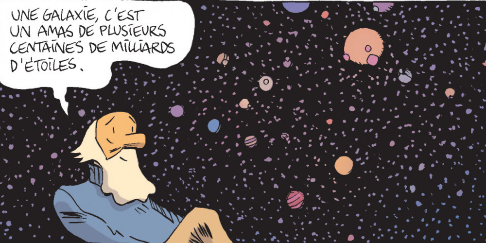 Tel un savant grec, barbe blanche et mains dans les poches, l’astrophysicien Hubert Reeves se balade sous les étoiles et nous embarque, grâce au très poétique dessin de Daniel Casanave, dans un voyage cosmique et… philosophique.