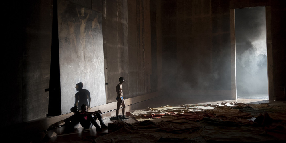 L’espace vide impressionne par ses proportions: hauteur, largeur, profondeur. Les murs très élevés sont destinés à accueillir de gigantesques toiles de maîtres. D’ailleurs tandis qu’un employé nettoie le sol avec une machine, d’autres s’affairent à accrocher ou décrocher – cela n’est pas clair – une crucifixion. Nous sommes dans la salle Rubens du Musée royal des Beaux-Arts d’Anvers; plus précisément, nous nous trouvons à l’intérieur d’une reconstitution de cette salle conçue par le collectif belge FC Bergman qui en a produit une réplique à l’identique installée dans le Parc des Expositions à quelques kilomètres d’Avignon. Ce collectif composé des comédiens et plasticiens, Stef Aerts, Joé Agemans, Bart Hollanders, Matteo Simoni, Thoas Verstraeten et Marie Vinck, s’est illustré depuis sa naissance à la fin des années 2000 par ses créations hors normes dont Het land nod constitue un exemple particulièrement significatif.