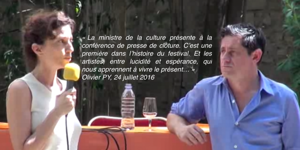 La quotidienne #19 (suite et fin): « La ministre de la culture présente à la conférence de presse de clôture. Une première dans l’histoire du festival. Et les artistes, entre lucidité et espérance, qui nous apprennent à vivre le présent… » Olivier Py, 24 juillet 2016.