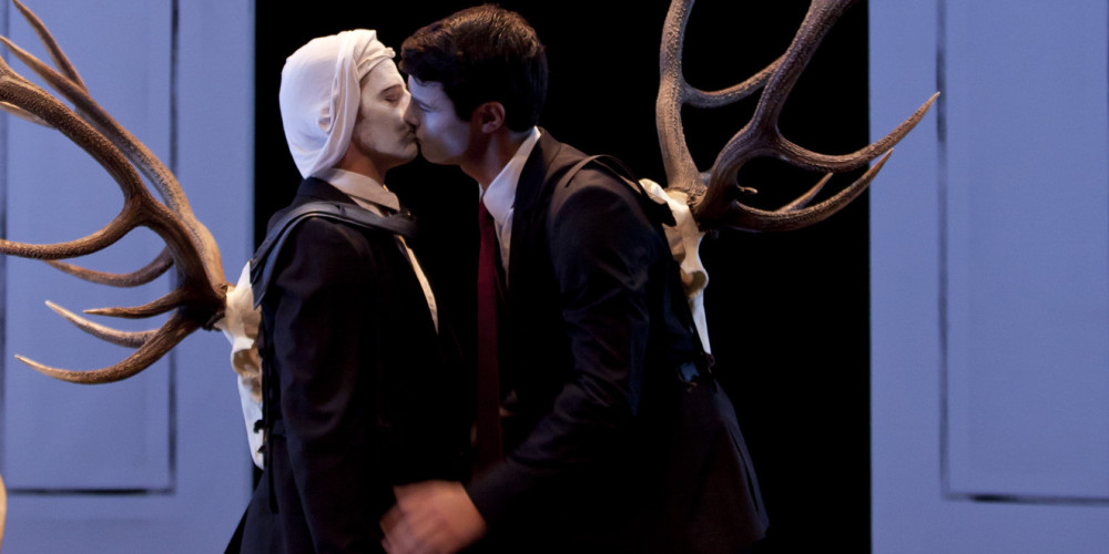 Ce serait faire fausse route que de croire que le texte de Denis Lachaud s’inscrit dans le prolongement de la légalisation du mariage pour tous, voire dans le mauvais débat sur une hypothétique théorie du genre. Tout au plus, l’auteur s’amuserait de ces résonances. D’ailleurs « Hetero« , sans accent, renvoie plutôt à la racine grecque du mot: « l’autre » et c’est bien de cela qu’il s’agit ici. Imaginer un faux monde unisexe permet paradoxalement de poser de vraies questions. Sans prise de tête, la pièce est drôle d’un bout à l’autre. Lachaud connait son sujet et sa mécanique du rire surprend constamment, notamment quand il mélange imperceptiblement les styles: le boulevard, le grotesque, le non sense et, fallait oser, la tragédie antique quand on est dans une pure comédie. Et s’amuse à glisser quelques notes surréalistes quand, par exemple, l’un de ses personnages se prend (dans de jolies tirades) pour un arbre ou une montagne. Surréalisme? Thomas Condemine, embraye, il fait entrer ses (excellents) acteurs par les fenêtres, sans raison, les affuble de bois de cerfs ou les asperge généreusement de peinture fraîche.