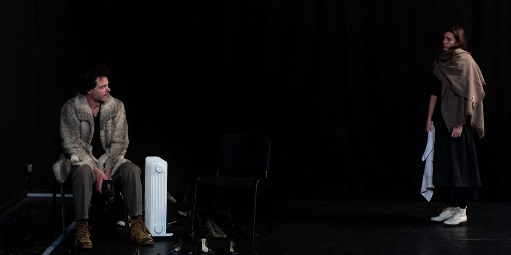 Sur le sol sont alignées des chaussures. Nous sommes dans le local d’un cordonnier. Dans cet espace plongé dans une légère pénombre, K., le héros du Château de Kafka, écoute avec intérêt le récit d’Olga. Il est assis sur une chaise d’un côté de la pièce au milieu des souliers. Elle se tient debout, de l’autre côté, adossée au mur. Ils ne se font pas vraiment face, ne se regardent presque jamais, pourtant malgré la distance qui les sépare on comprend que quelque chose d’essentiel se trame entre eux.