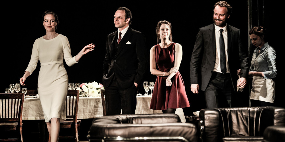 La pièce commence dans l’euphorie mondaine et trompeuse d’un dîner élégant. Au premier plan, un piano à queue et de luxueux fauteuils en cuir noir situent l’action dans la haute société. Au fond, des portes coulissantes noires s’ouvrent et se referment sur une salle à manger où tout semble se jouer. Côté jardin, un escalier imposant évoque un sublime loft berlinois ou new-yorkais : le regard est constamment attiré par cet élément du décor qui va se perdre dans les cintres. Trois femmes, en robes blanche, jaune et prune, très Jackie Kennedy, sont d’une distinction aussi irréprochable que leurs financiers de maris et de fils. Regina, la maîtresse de maison, épaulée de ses deux frères Ben et Oscar, sort le grand jeu à son invité de marque, l’investisseur new-yorkais Marshall. Grâce au plateau pivotant, chacun y va successivement de son numéro de charme pour plaire au puissant banquier. Les nouveaux riches ne le sont jamais assez et les millions en appellent d’autres : pour participer à l’entreprise juteuse que Marshall leur propose, les deux frères et la sœur sont prêts à sortir les crocs, et à s’en servir.