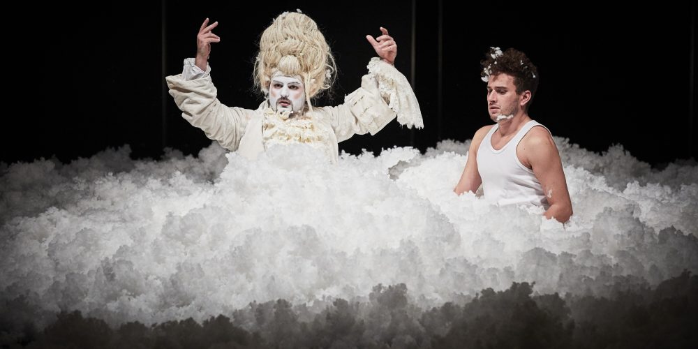 Tout a commencé dans un bouillonnement d’écume blanche tombée des cintres. Au milieu de ce maelström surnagent nos quatre personnages passablement secoués. Rescapés d’un naufrage, ils ont échoué sur l’île des esclaves qui donne son titre à la pièce. Là règne un magistrat quelque peu philosophe répondant au nom de Trivelin.