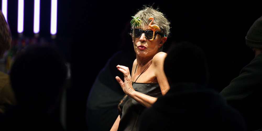 Une des idées judicieuses de ce spectacle a été de supprimer la scène pour installer l’actrice de plain-pied avec le public. Ce choix s’il n’annule pas totalement la distance indispensable au théâtre, crée tout de même une relation différente. Circulant parmi les spectateurs, avec son allure singulière, sa taille élancée et des lunettes fantaisies qui ajoutent une amusante touche d’étrangeté, Claude Degliame évoquerait presque, par sa capacité à s’adresser aussi bien à chacun en particulier qu’à l’ensemble de la salle, une meneuse de revue. Sauf qu’ici le show hautement paradoxal recèle en son sein une fêlure constitutive, doublé d’une troublante fragilité.