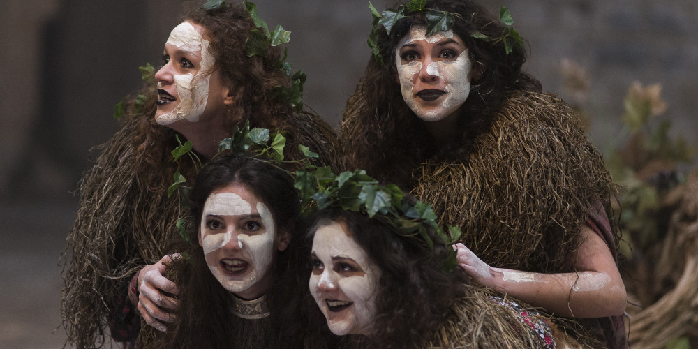 Au centre du plateau, un pied de vigne couvert de feuilles enlace les pierres du mausolée de sa mère foudroyée par Zeus. La maison de Sémélé n’a pas échappé à la destruction par le feu divin et c’est sur un paysage de ruines que s’ouvrent ces Bacchantes avec la projection en fond de scène de murs en partie effondrés. Par sa mère Dionysos descend de Cadmos roi de Thèbes. Devenu vieux, Cadmos a transmis son pouvoir à Penthée, son petit-fils, interprété par Matthieu Marie qui joue aussi le rôle de sa mère Agavé. C’est lui qui règne sur la ville au moment où Dionysos venu de Lydie avec une troupe de Ménades pose pour la première fois le pied en Grèce.